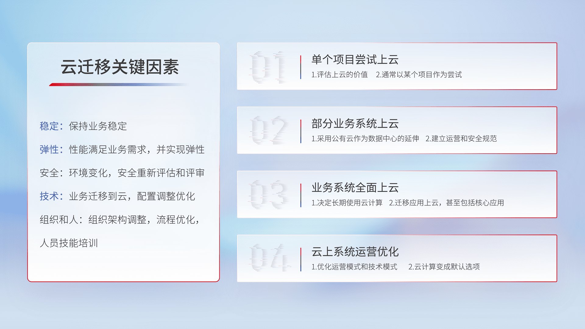 结合实际业务,,,,从规划设计、、云平台选型、、云原生改造、、、数据迁移、、、集成交付,,,迁移全过程为客户识别最佳上云路径,,,,做好风险识别管理,,,,设计网络架构、、、身份权限、、安全审计合规、、、操作审计、、、、日志审计、、监控告警策略、、多站点容灾设计等,,,,对云上基础设施进行整体规划,,,,提升IT治理水平,,以满足弹性、、、、高可用、、高性能的需求。。。。